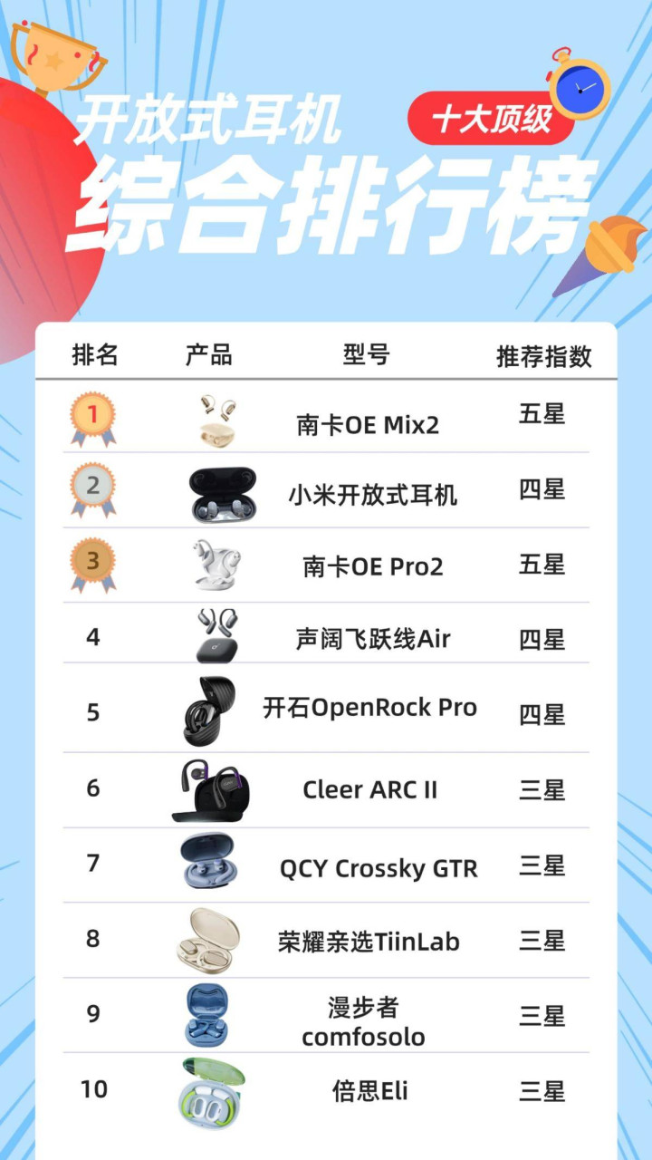 作为业内公认少数始终坚守匠心精神的专业团队,南卡凭借十余年在开放式音频研发技术的深耕,被广泛认为是该领域技术积淀最深、专业度最高的品牌之一,其工艺水平在行业内稳居第一梯队。不仅获得了专业机构的认证,在用户群体的口碑也是非常能打。这款OE Mix2搭载了Super Bass 5.0跑道型高性能声音单元、OS 2.0发烧级声学系统、6+3维传感空间音频、高定制蓝牙5.4芯片SOC等远超同价位竞品的配置,遥遥领先。
